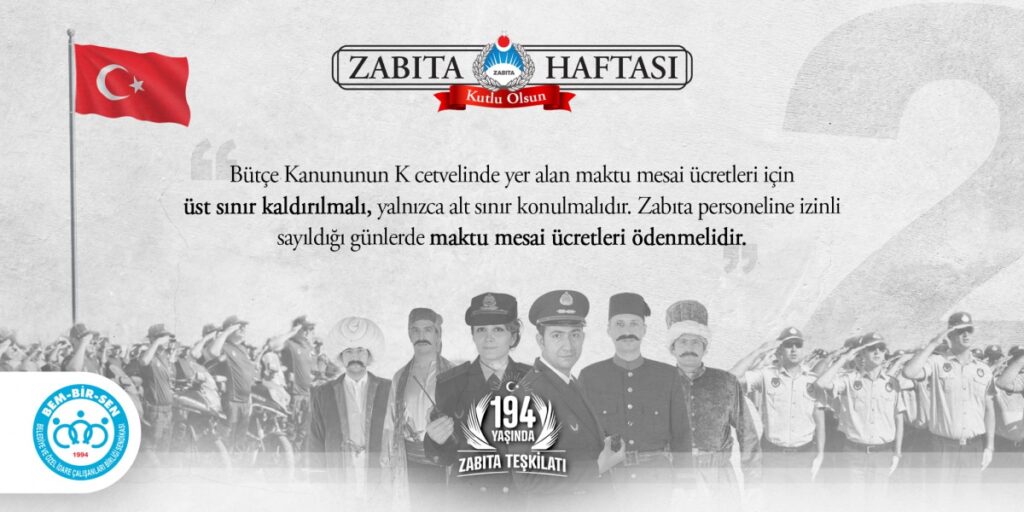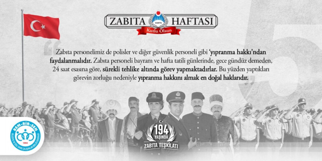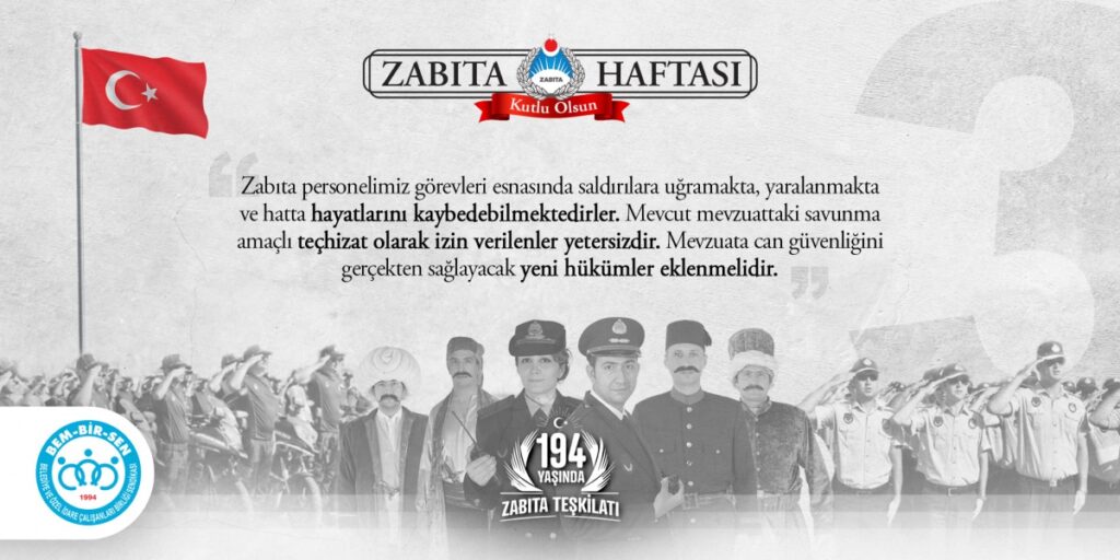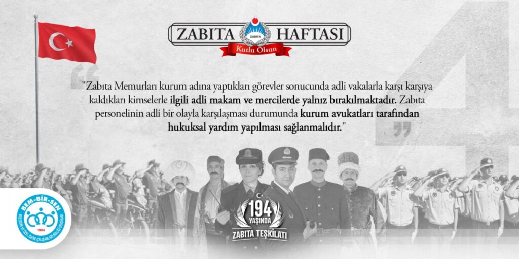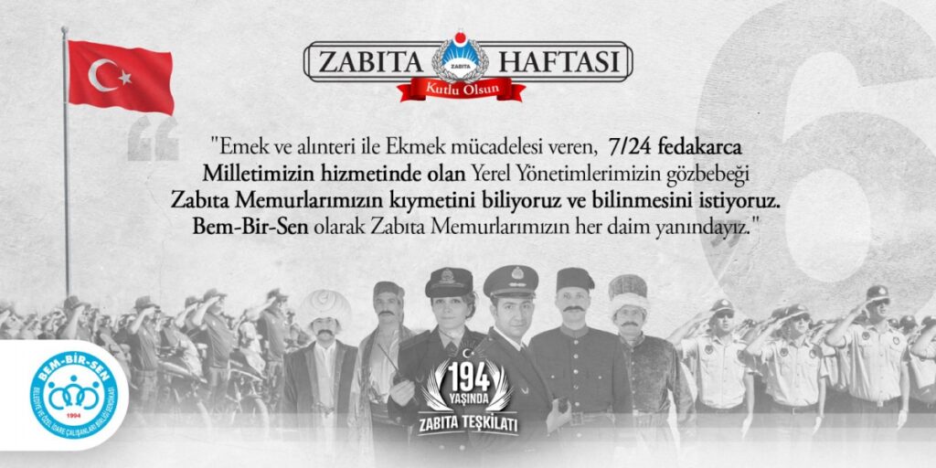Öte yandan Zabıta Teşkilatımızın kuruluşunun 194. yıl dönümünü kutlayan Genel Başkanımız Levent Uslu, Zabıta Memurlarımızın Yerel Yönetimler Hizmet Kolunun 15 yıldır yetkili sendikası Bem-Bir-Sen’in örgütlü gücünün bu noktaya gelmesinde önemli bir rol üstlendiğini ifade ederek, “15. yetki yılında önemli lokomotiflerimizden olan Zabıta Memurlarımızla bu günlere geldik. Bem-Bir-Sen olarak ülke genelinde hangi Zabıta Teşkilatlarımızda örgütlenmiş isek o belediyede yetkili sendika olduk. Örgütlü yapımızla Zabıta Memurlarımızın yaşadığı sorunların çözümü noktasında bugüne kadar birçok adım attık, çözüm ürettik, sıkıntı ve sorunları çözdük. Bugünden sonra da aynı şekilde her türlü sıkıntıda Devletimizin ve Milletimizin hizmetinde en ön safta yer alan Zabıta Memurlarımızın sorunlarına çözüm aramaya devam edeceğiz.” diye konuştu.