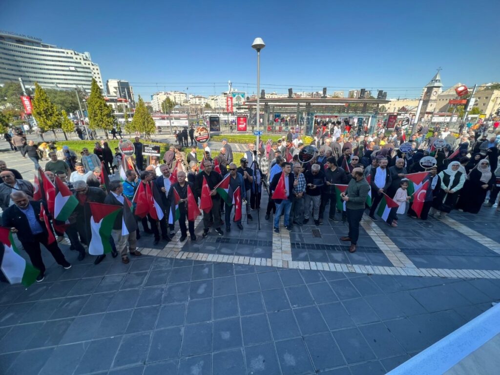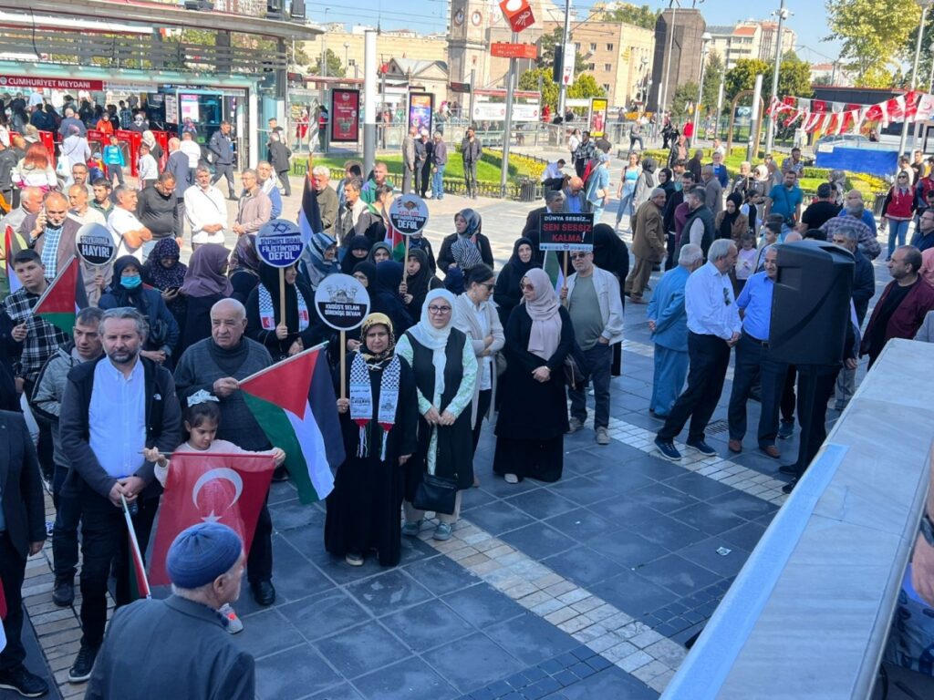 Türk ve Filistin bayrakları ile meydanda bulunan Üyelerimiz Siyonist rejim aleyhine sloganlar atarak soykırıma karşı tepkilerini ortaya koydular.